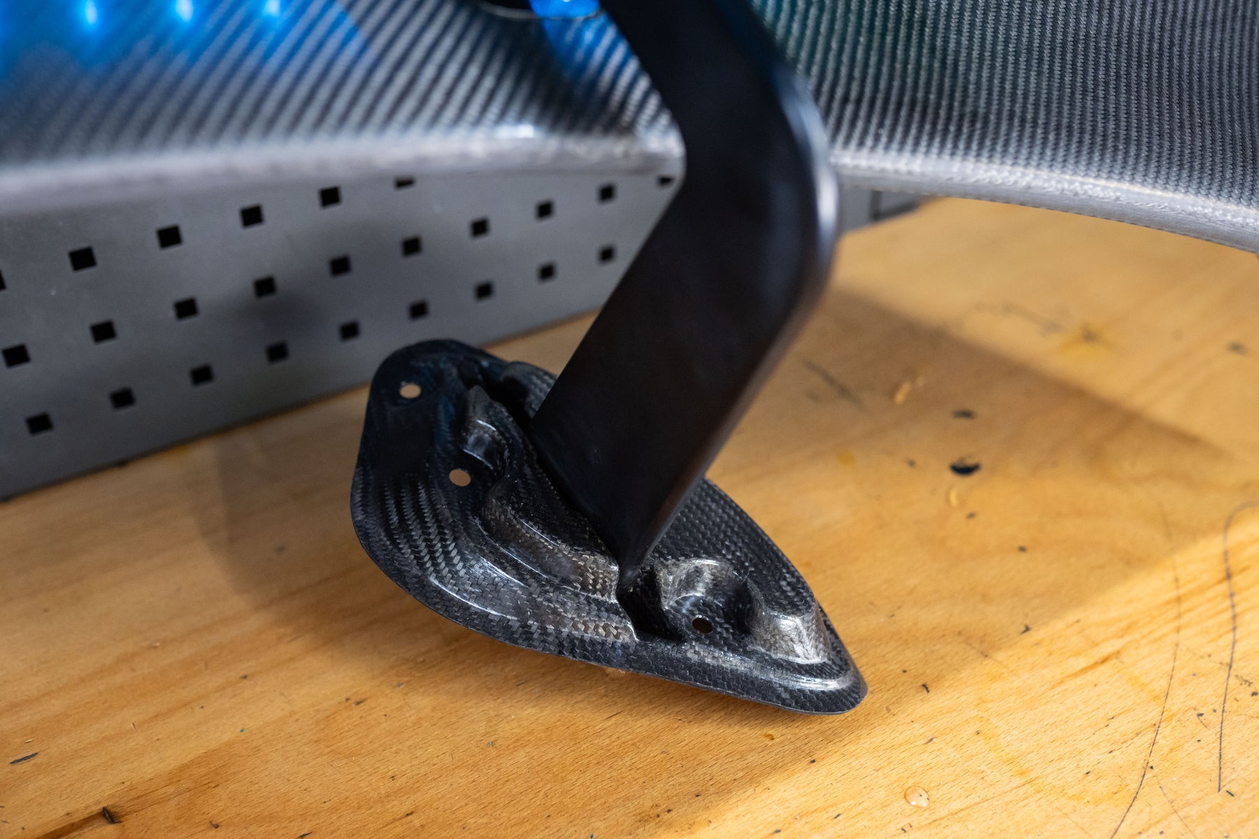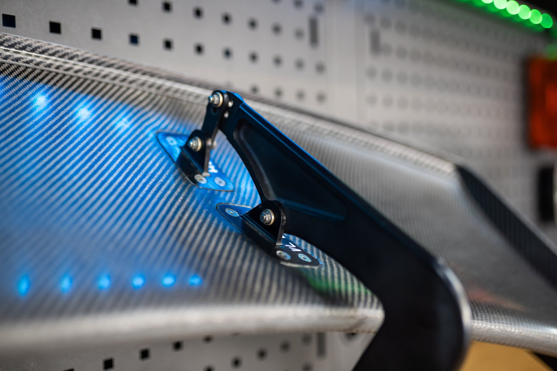 The wing is supported by CNC-machined, anodised aluminium uprights, engineered for maximum stiffness under high load. A bonded carbon retaining cup is integrated into the underside of the boot lid, ensuring precise load transfer and long-term structural integrity. The wing angle is fully adjustable, allowing fine tuning of rear downforce to suit circuit, tyre and setup.